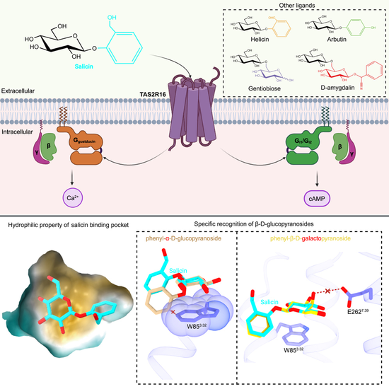 苦味感知是人类抵御有毒物质的重要防御机制,由25种TAS2R家族受体介导,均属于G蛋白偶联受体(GPCR)class T家族。其中,TAS2R16以其对β-D-吡喃葡萄糖苷类化合物(如柳树皮中的水杨苷、杏仁里的苦杏仁苷)的特异性识别而著称。水杨苷是阿司匹林的前体,具有抗炎作用,TAS2R16的异常激活还与口腔炎症和癌症相关。然而,TAS2R16如何精准识别β-D-吡喃葡萄糖苷结构并激活下游信号通路的分子机制一直未被阐明。