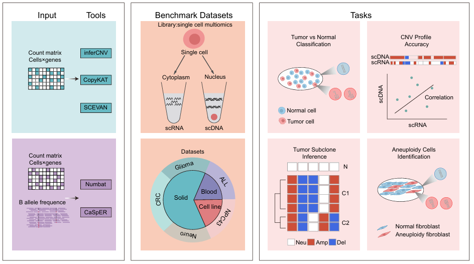 CNA是一种重要的基因组变异类型,在癌症的发生和发展中起着至关重要的作用。肿瘤细胞中CNA的鉴定对早期肿瘤检测、描述肿瘤异质性、了解肿瘤进展和揭示治疗耐药机制具有重要意义。单细胞DNA测序(scDNA-seq)非常适合在单细胞分辨率下鉴定CNA。scDNA-seq虽然能够提供单细胞分辨率的CNA检测能力,但因其技术的局限性——包括测序覆盖度不足与实验成本过高,严重制约了该技术在拷贝数变异研究中的规模化应用。为此,计算生物学专家们已开发出多种基于scRNA-seq数据的CNA推断算法,通过利用基因表达量与拷贝数之间的相关性,成功实现了肿瘤内异质性的高分辨率解析。但目前尚未建立系统化的评估框架,这些计算方法在真实临床场景中的准确性、稳健性与可重复性仍缺乏跨平台验证。
