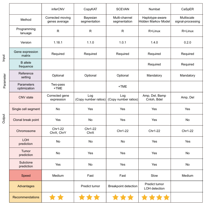 本研究观察到,所有五种工具均能在一定程度上区分肿瘤细胞和正常细胞,并能较为准确地推断拷贝数变异图谱。在这些方法中,Numbat在各项评估标准中表现最佳。对于仅有表达矩阵可用的情况,推荐使用CopyKAT作为首选方法。同时也展示了目前方法的一些局限,提示一些未来方法学的开发和改进的需求。整体的评估结果(图3)为临床研究人员提供了客观的选型依据。