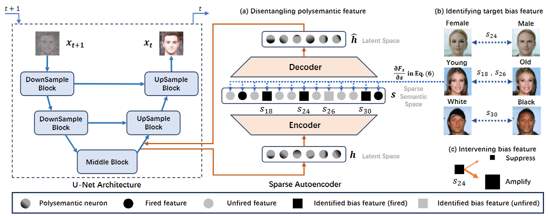 生成扩散模型在多样化内容合成领域展现了卓越的能力,但其保留训练数据偏见的输出往往会加剧社会的刻板印象与不平等。当前去除偏见的研究多聚焦于生成过程的引导策略,却忽视了模型内部驱动偏见内容输出的因果机制。本研究通过剖析扩散模型的内在决策机理,创新性地提出基于特征干预的模型编辑技术,实现偏见生成要素的精准定位与动态调控,达到社会偏见的高效纠偏。在保持生成图像质量的同时,对生成分布(社会属性的分布,如男性与女性的比例)实现有效调控。模型中存在控制生成细粒度特性的差异化内在特征,为生成模型的机制可解释性研究提供了全新的视角与方法。