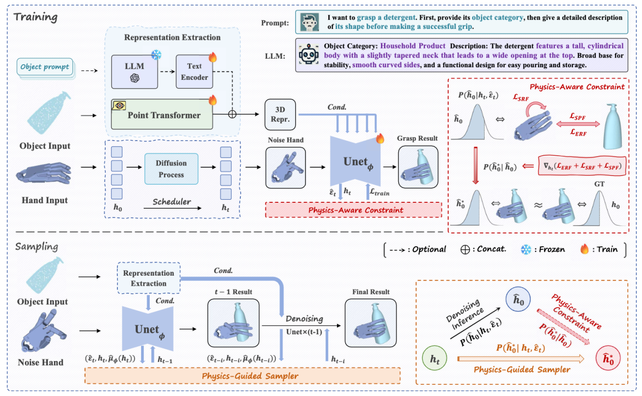 能够抓取任何物体的灵巧手是开发通用型具身智能机器人的必要条件。由于灵巧手的高度自由度和物体的巨大多样性,以鲁棒的方式生成高质量、可用的抓取姿势是一个重大挑战。本研究提出了一种将物理约束有效地集成到基于扩散的生成模型的训练和采样阶段的方法DexGrasp Anything,可在几乎所有开放数据集中实现最先进的性能。此外团队还提出了一个新的灵巧抓取数据集,包含超过340万种不同的抓取姿势,超过15k个不同的对象,展示了其推进通用灵巧抓取的潜力。
