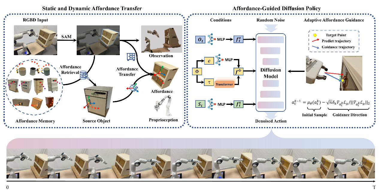 基于扩散的策略在机器人操作任务中表现优异,但在处理域外分布时存在局限。本研究提出AffordDP,利用可供性(affordances)增强对未见对象的泛化能力。通过3D接触点和轨迹建模动静态affordances,结合视觉模型和点云配准实现跨类别泛化,并在扩散采样中引入可供性引导优化动作生成。仿真和真实环境中的实验结果表明,AffordDP在性能上持续优于以往的基于扩散的方法,并成功泛化到其他方法无法处理的未见实例和类别。