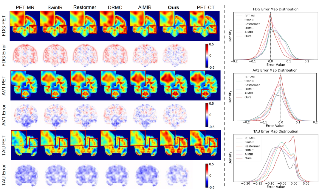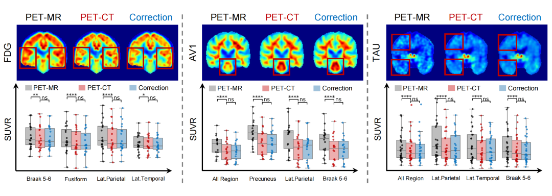 正电子发射断层扫描-磁共振成像技术(PET-MR)作为临床分子影像领域的革命性进展,同时具备 MRI 优异的软组织对比度、低辐射暴露风险及多参数代谢-解剖同步评估能力。然而,系统性临床评估显示,PET-MR 与 PET-CT 扫描之间的标准摄取值比(SUVR)存在显著差异,这主要因为基于 MR 的 PET 衰减校正方法存在固有的技术局限。为弥合这一差异,王乾教授课题组硕士研究生钟奥程等提出了一种基于结构项引导并统一多示踪剂的 PETMR 摄取校正算法,旨在实现不同示踪剂条件下 PET-MR 与标准 PET-CT 扫描结果的摄取量化一致性。在包含 70 名患者的三种示踪剂(FDG、AV1、TAU)数据上进行了全面实验结果表明,经本框架校正后的 PET-MR 影像,其在摄取量化一致性方面优于现有方法,更接近标准 PET-CT 扫描结果。本研究首次针对多示踪剂 PET-MR/PET-CT 扫描间的摄取量化差异问题提出了高质量解决方案,有望显著推进 PET-MR 的临床标准化进程。