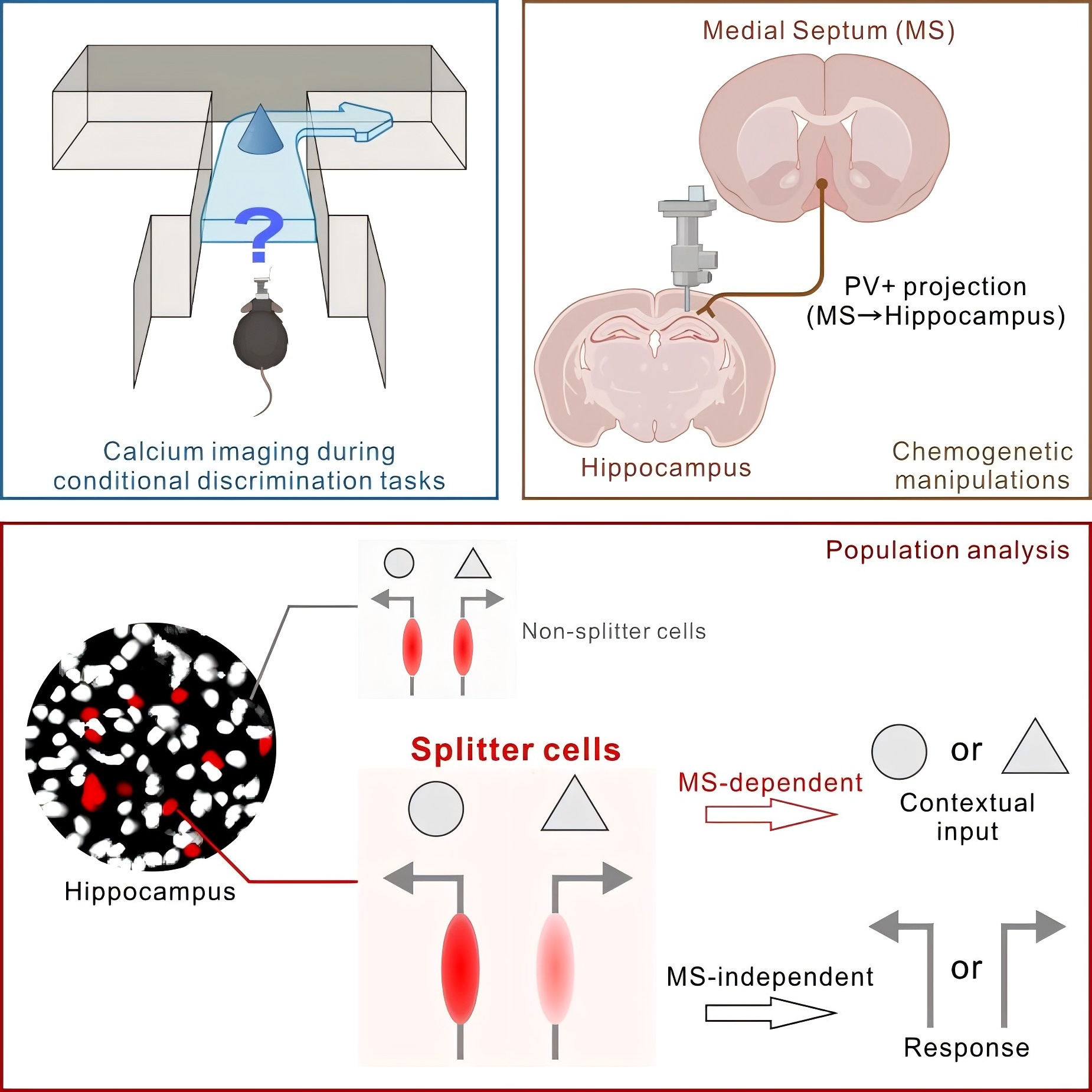 在动态变化的复杂环境中,大脑如何高效整合外界信息并产生精确的行为策略?这一高级认知功能的神经基础与海马体内一类功能性神经元——区分细胞密切相关。研究团队通过整合MiniScope活体钙成像技术、双选条件辨别行为学范式以及神经环路操控实验,系统探讨了海马区分细胞在关联记忆任务中的作用。